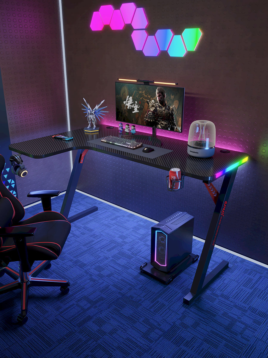 Maximize your corner space with the Gamax P201-LB. This professional L-Shaped gaming workstation is specifically designed for left-side corner placement, offering a massive 140cm x 100cm surface area. Whether you are running a triple-monitor setup or combining a PC and Console station, the P201-LB provides the ultimate panoramic workspace with the signature Gamax carbon fiber finish and immersive RGB lighting.